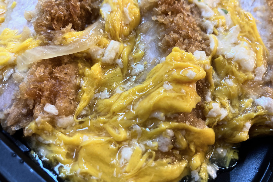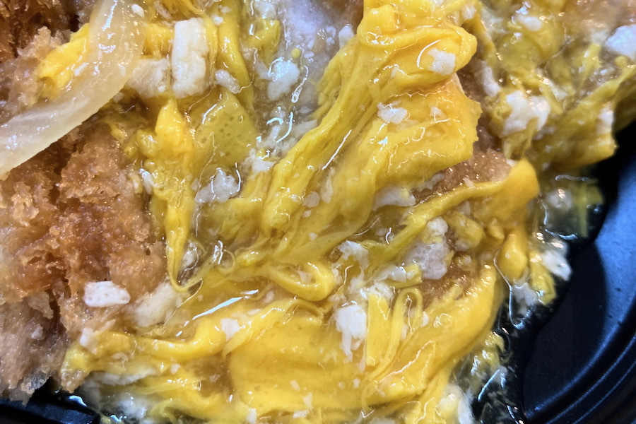 カツをご飯にのせた上から塩麹で味付けしたユルいスクランブルドエッグをかけてますよ